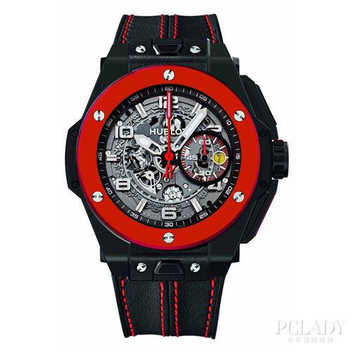 最新推出的这款宇舶Big Bang法拉利亮红色陶瓷香港独家限量腕表,发布契机是宇舶表携手法拉利共庆进驻香港市场30周年。它完美融合了宇舶表制表厂的全部创新科技,更成功推出全新材质的亮红色陶瓷。腕表直径45.5毫米,以黑色陶瓷表壳搭配圆柱形亮红色陶瓷表圈,凸显蓝宝石表盘下的UNICO飞返计时机芯(时间可任意重置)。UNICO计时机芯堪比性能一流的赛车引擎,用以驱动Big Bang 法拉利系列。组件数量超过330个,表盘可见导柱轮和双水平轴承。每小时振动频率为28,800次。